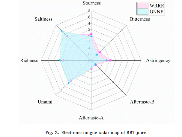使用电子舌比较WRRT和GNNF的鲜味、丰富度、咸味、酸味、苦味、涩味、回味苦味和回味涩味(图2)。两组样品均表现出风味、丰富度、咸味和酸度,其中GNNF表现出更明显的存在。GNNF和WRRT的苦味和涩味相对较低,其中WRRT的苦味和涩味略高于GNNF,这可能是由于RRT汁中苦味物质的相对含量较低。