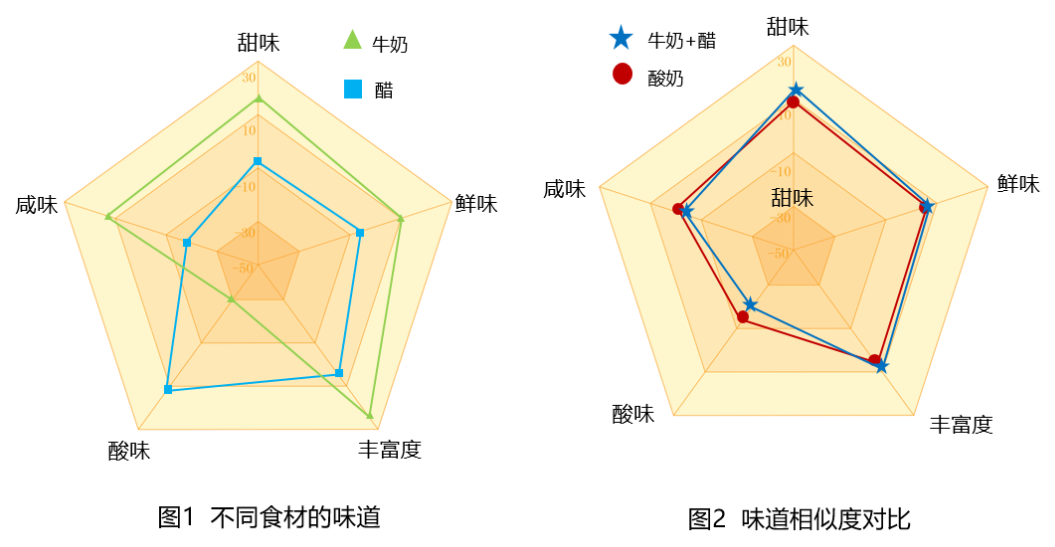 如图1,电子舌味觉雷达图可见:牛奶的甜味、咸味、咸味和丰富度的值均在10以上。在牛奶中加入少量醋后,牛奶的咸味降到0以下,即没有咸味,丰富度也有所减弱,但整体上加少许醋的牛奶与酸奶味道相似。